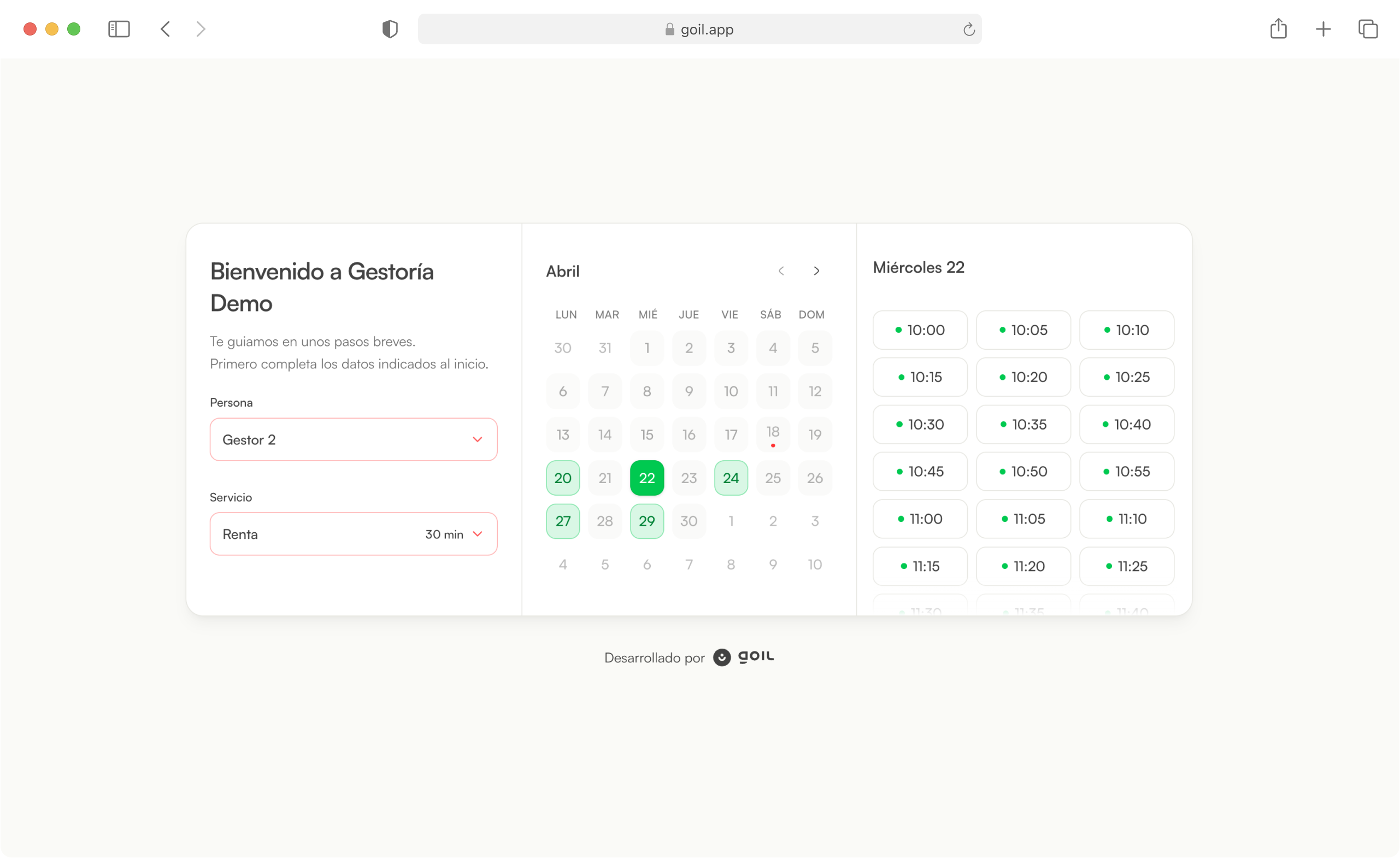 Cada socio o asesor tiene su enlace público o todos pueden compartir uno. Los clientes ven la disponibilidad real, sin llamar ni esperar respuesta.